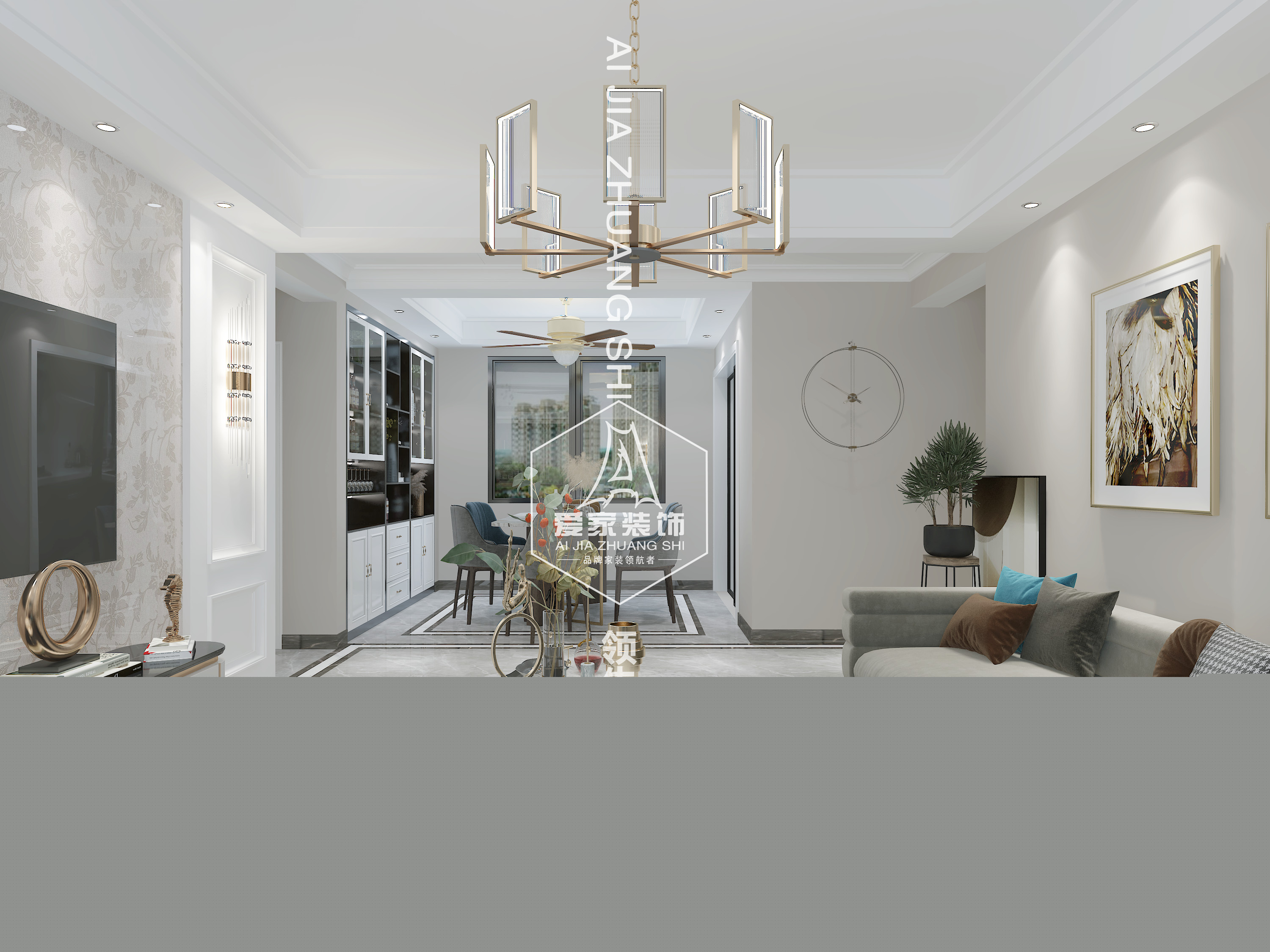 該戶型是比較典型的三室兩廳兩衛(wèi),雙陽臺南北通透,主人是一對中年夫妻,兒子媳婦周末會帶孩子過來,因此對原始結(jié)構(gòu)沒有進行大的改動,保留了三個起居室和兩個衛(wèi)生間的基本需求。風(fēng)格方面采用的比較中規(guī)中矩的現(xiàn)代簡約風(fēng)格,現(xiàn)代簡約是近些年來最常見的風(fēng)格,因其適用人群廣、不輕易淘汰而受到很多業(yè)主的青睞。該戶整體色調(diào)以穩(wěn)重大方為主,軟裝輔以些許藍、黃作為點綴,提亮整個畫面,既符合主人家的年齡層又不會過于沉悶。地面瓷磚的波打線走邊在凸顯層次感的同時,也能很好的對區(qū)域進行一個較為明顯的劃分。