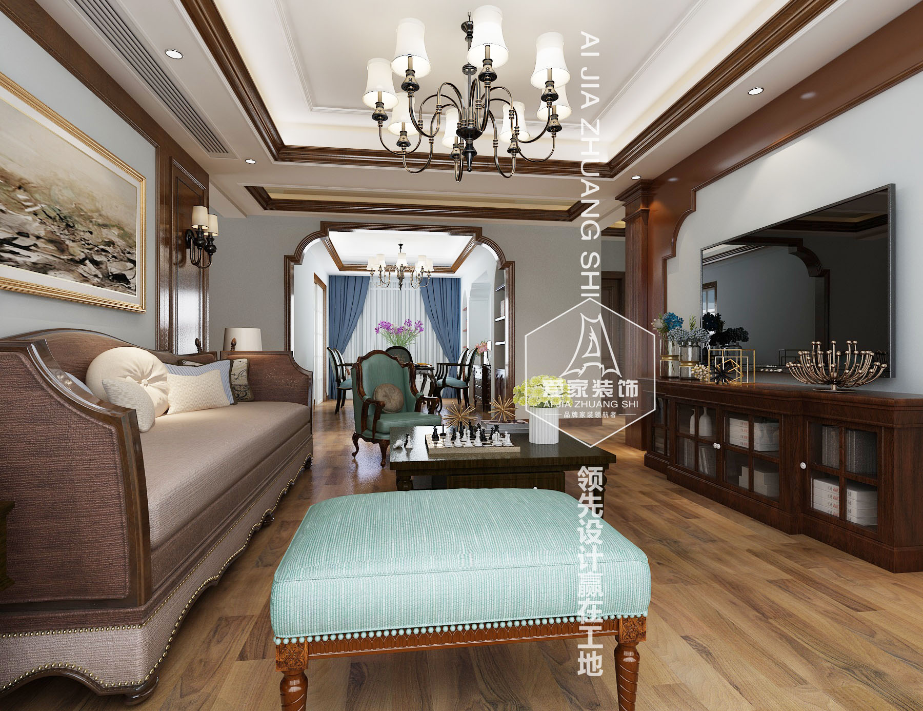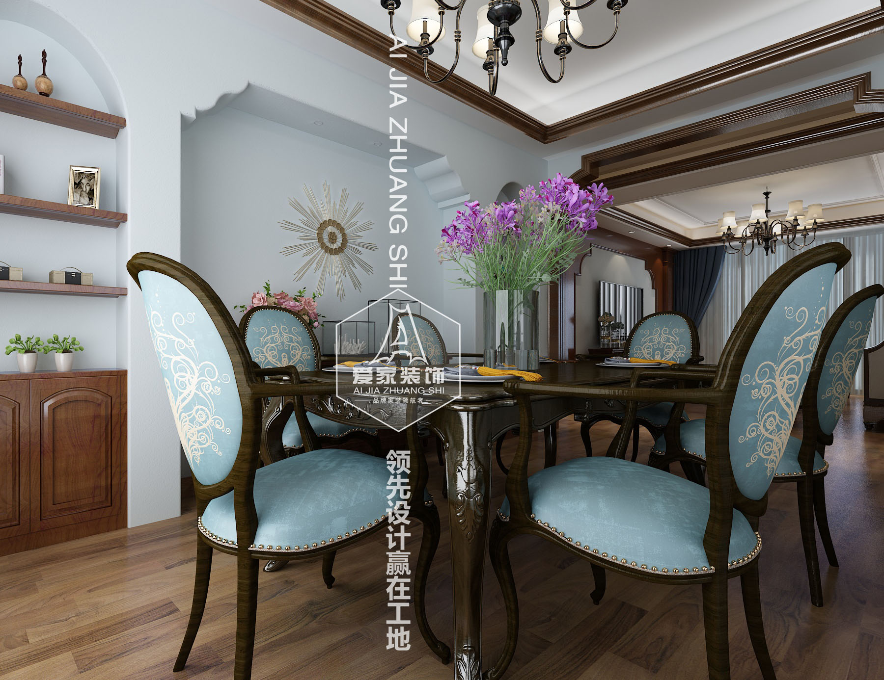 設(shè)計理念:原戶型結(jié)構(gòu)中餐客廳屬于連通關(guān)系,且面積較大,為了使空間更具層次性,我們利用拱券結(jié)合木柱形式進行分隔,衛(wèi)生間較小,且兩個衛(wèi)生間臨近功能重合,對其合并后,使原有的空間更為開闊舒適。整體空間中,使用了大量的木質(zhì)墻板。為了使整個空間更為輕松而不沉悶,我們在墻板空面結(jié)合了較為柔和的藍色,同時,通過對燈光的布置,增加了室內(nèi)的采光以及對氛圍的營造??蛷d的面積比較大,配合整體效果,墻面設(shè)計墻板來增加整體的圍合感,整體深淺對比,通過家具及軟裝的搭配使空間更加飽滿也更有生活的味道